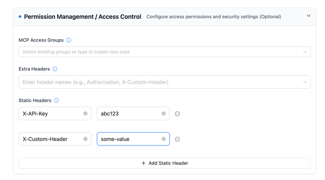 Static Headers: Optional map of header key/value pairs to include every request to the MCP server.