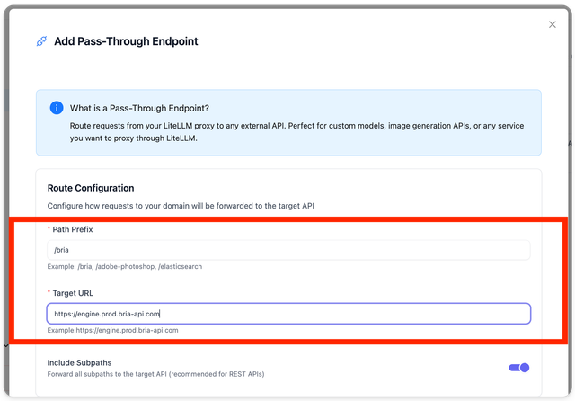 Path Prefix: The route clients will use when calling LiteLLM Proxy (e.g.,/bria,/mistral-ocr)Target URL: The URL where requests will be forwarded